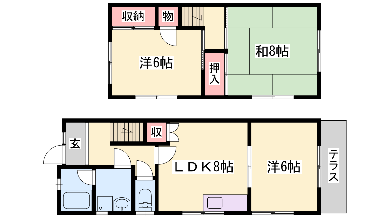 - LDK8帖、和室8帖、洋室6帖、洋室6帖