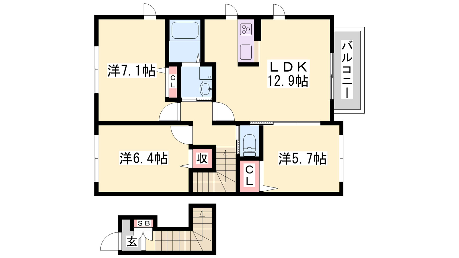 - LDK12.9帖、洋室7.1帖、洋室6.4帖、洋室5.7帖